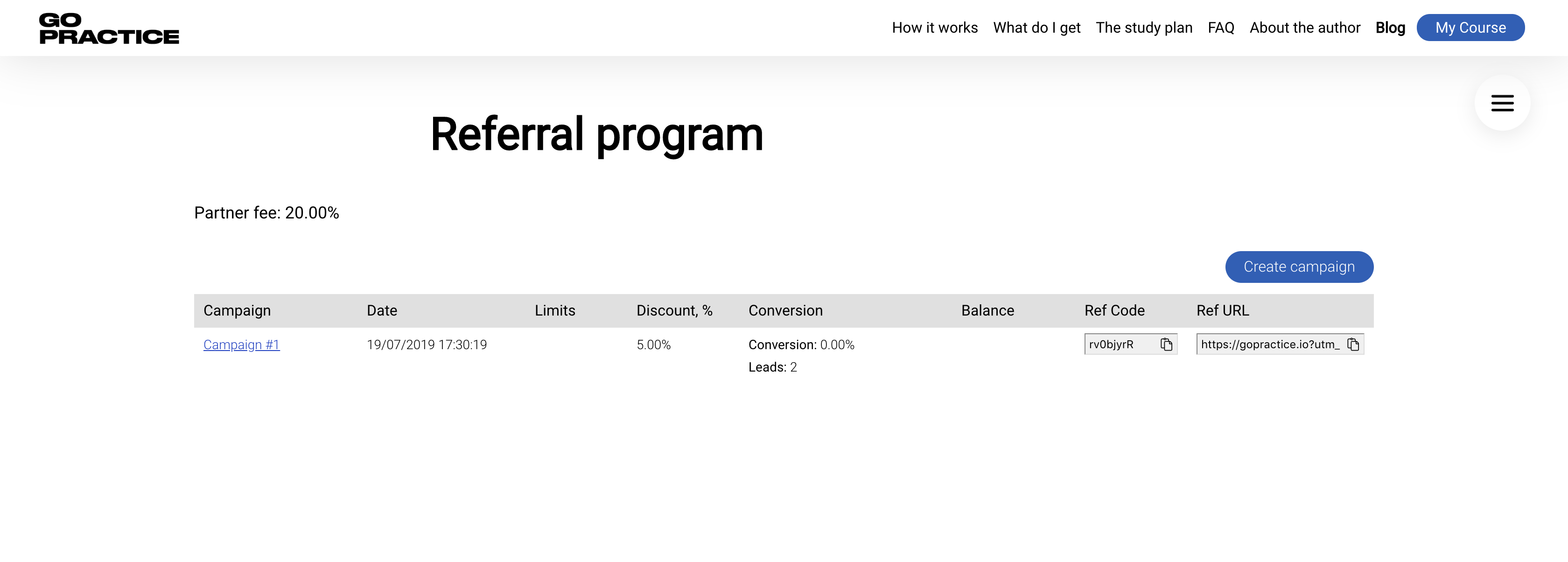 - If you want to participate in the partner’s program and you don’t have an account yet, please register on the website. After doing so, please write to partner@gopractice.io. We will answer all the possible questions and create a personal partner account for you.